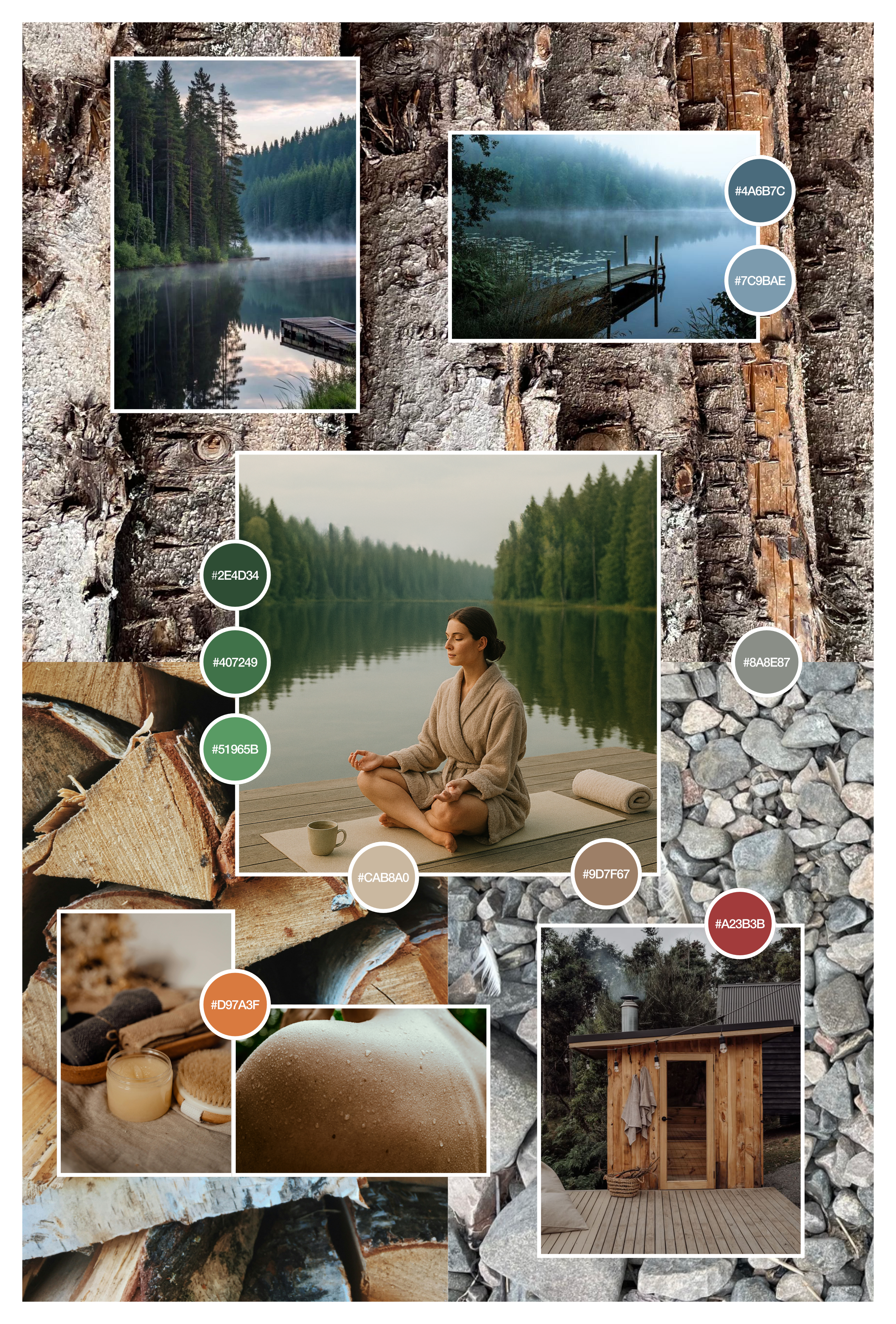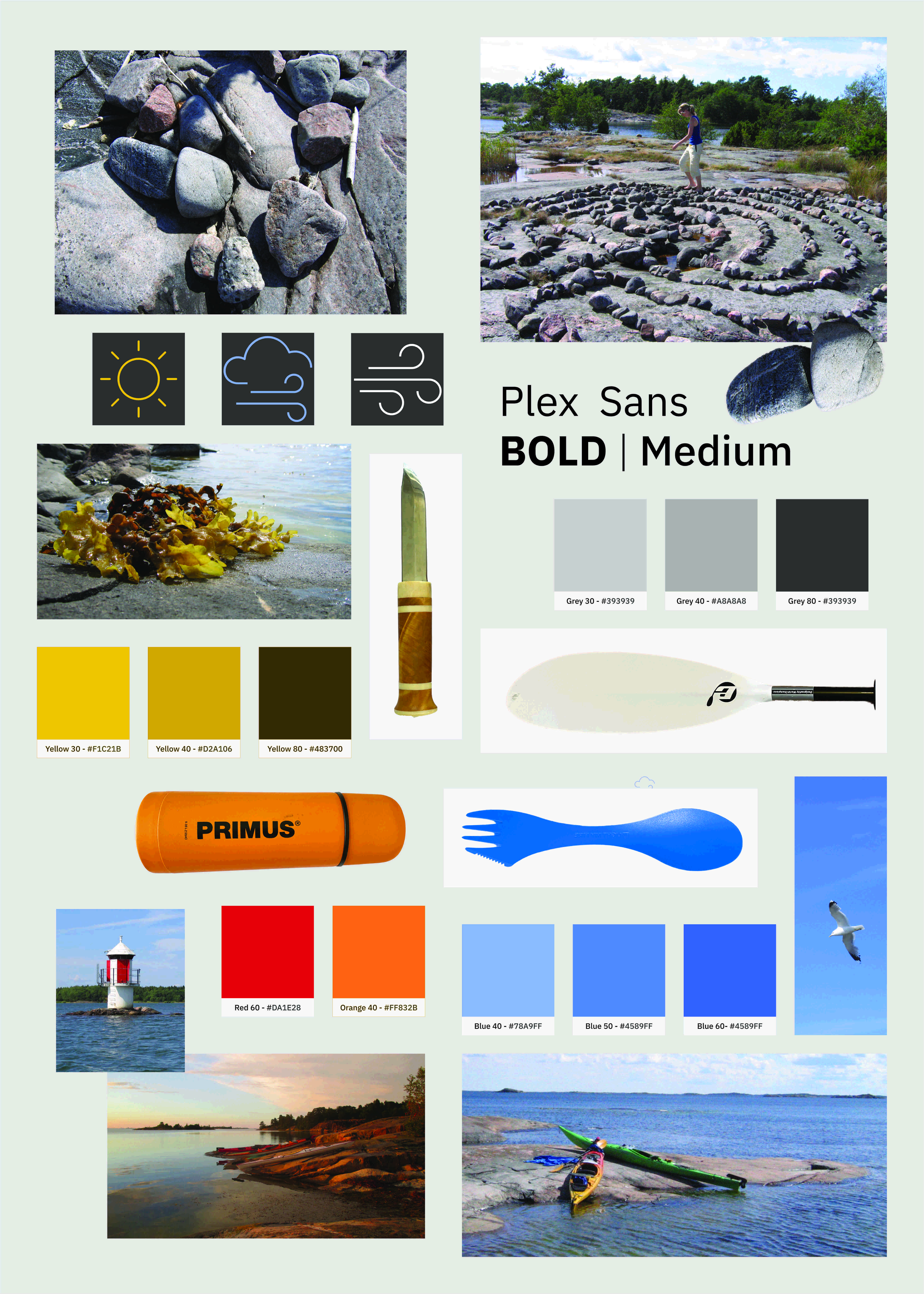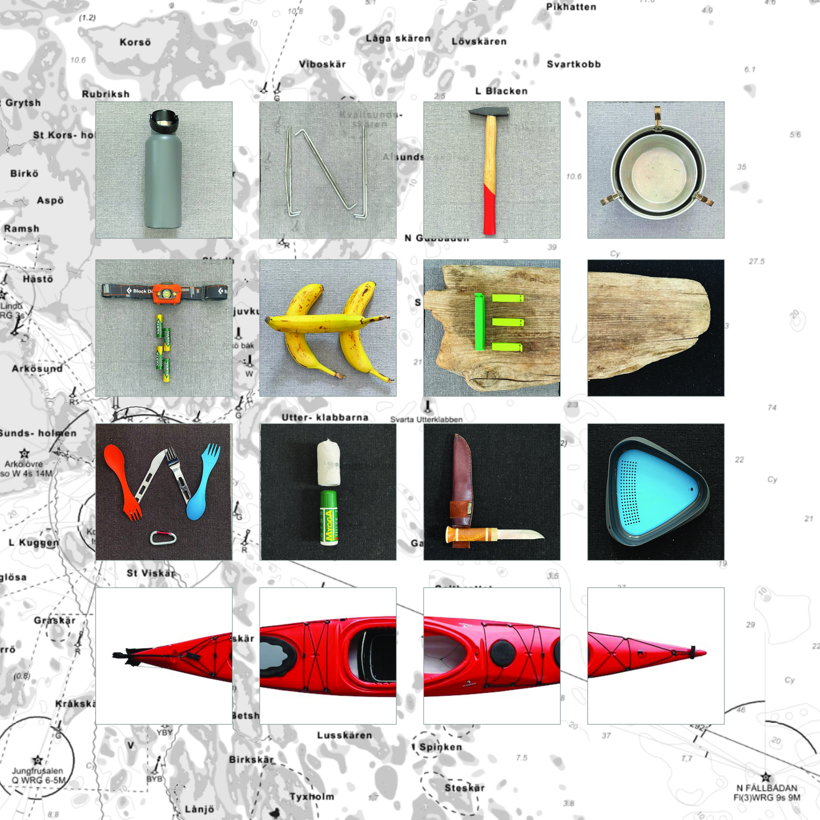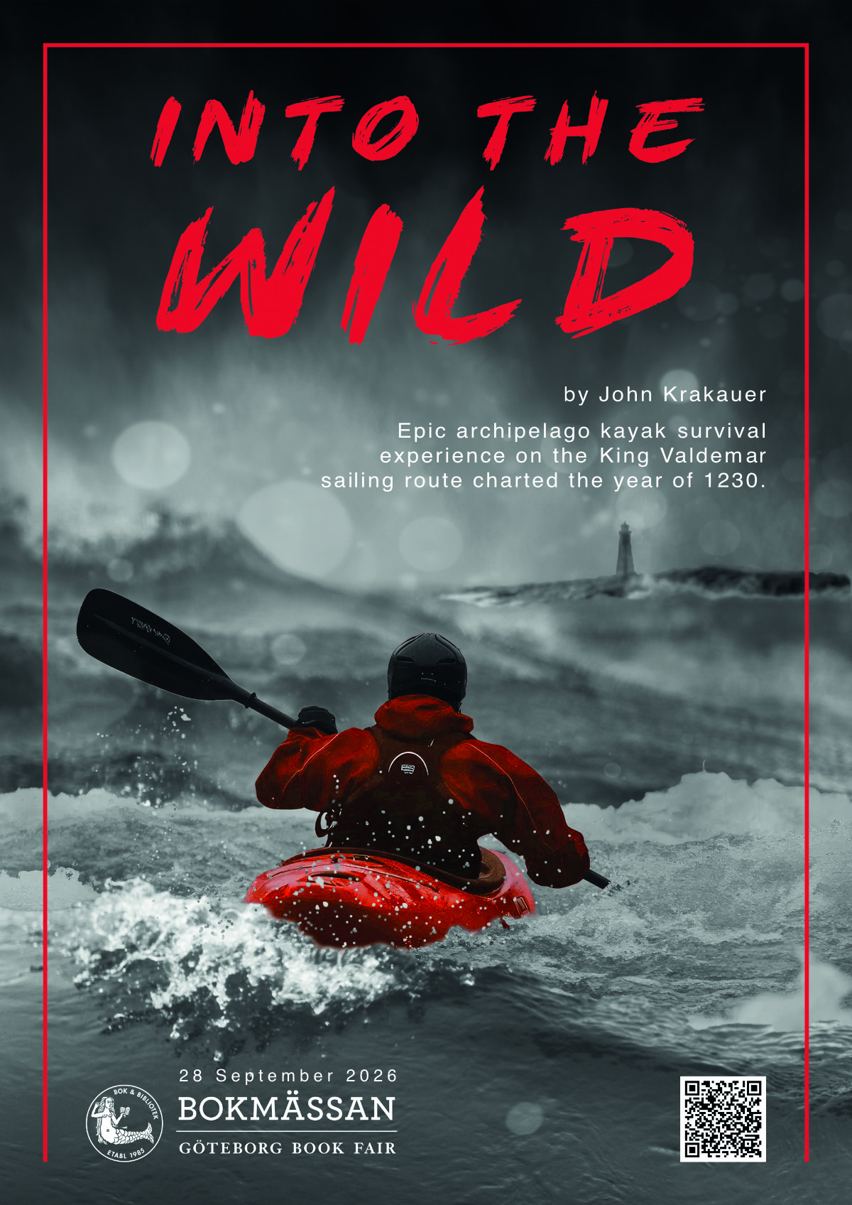 To make the kayak and sea appearance visually convincing, the sea waves photo has been masked into foreground and background layers. The kayak and its surrounding waves are placed in the layers stack between the foreground and background. A masked photo of Häradskär lighthouse has been added at the horizon. The sea and sky layers have been converted with a B&W adjustment to a harmonious greyscale. The kayak, the man, and equipment have been isolated into new layers by using selection tools and the ‘New Layer by Copy’ command. The colors of the kayak layers have been uniquely tuned by Contrast and HSL adjustment layers. This creates the recoloring to red, resulting in high contrast. The sky is central to the composition. It graphically creates a readable contrast, with grey ground to red text, and visually creates the connotation of survival under rough winter adventure conditions. Overall, the composition is using a vertical central line. The balance is achieved by the asymmetry of the waves and kayak to the left, balancing the copy text to the right. Similarity with the monochrome red color objects, in contrast with the grayscale background. Texts in proximity.