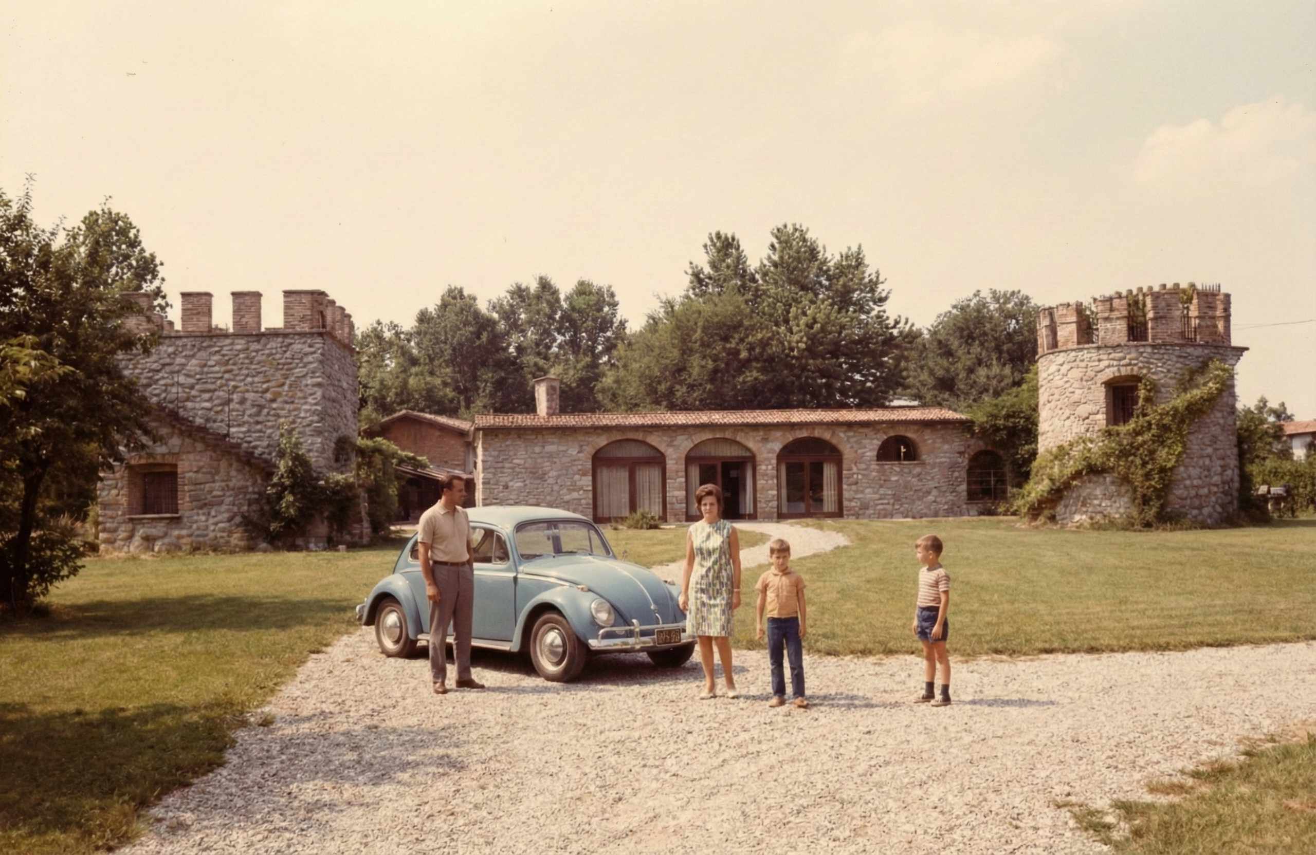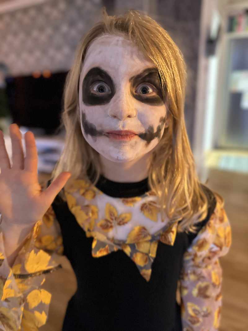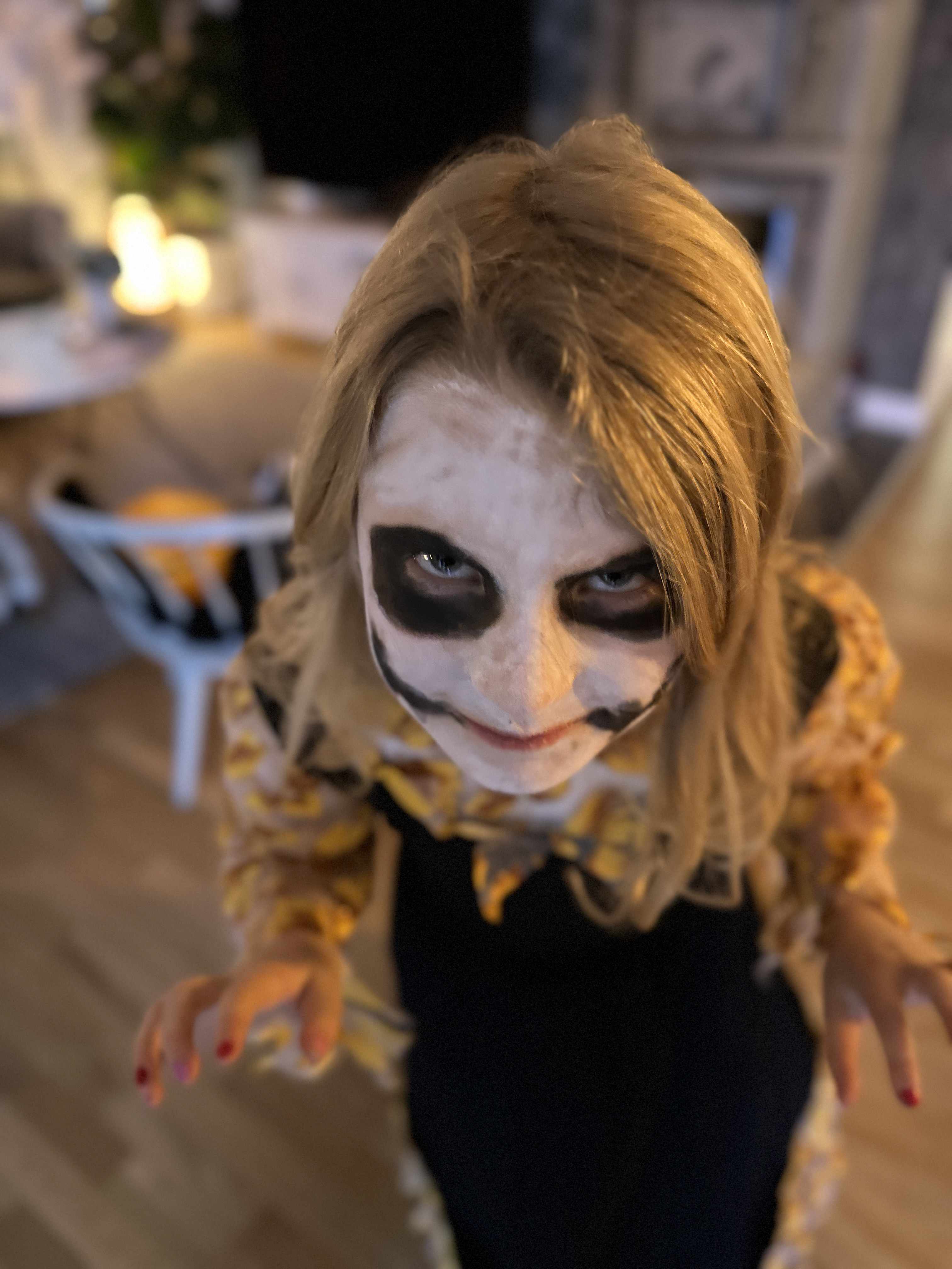 The composition is made up using our family photos. A background photo from Halloween at Kolmården in 2024. And two recent photos from 2025 with Ellie getting ready for a Halloween party at school. The montage also uses a fog stock image. Backgrounds in the Ellie-photos have been removed in Photoshop using the Object Selection tool and selection fine-tuning using the Quick Selection tool. The selections are used to create a mask that removes the photo background. Resulting twin characters have been added to the scene background so that Creepy-Twin is behind Happy-Twin in the foreground. Their individual scale has been adjusted to visually match their relative position and the perspective to the background. Their head positions have been guided by the Rule of Thirds, creating a dynamic symmetry to the final image.