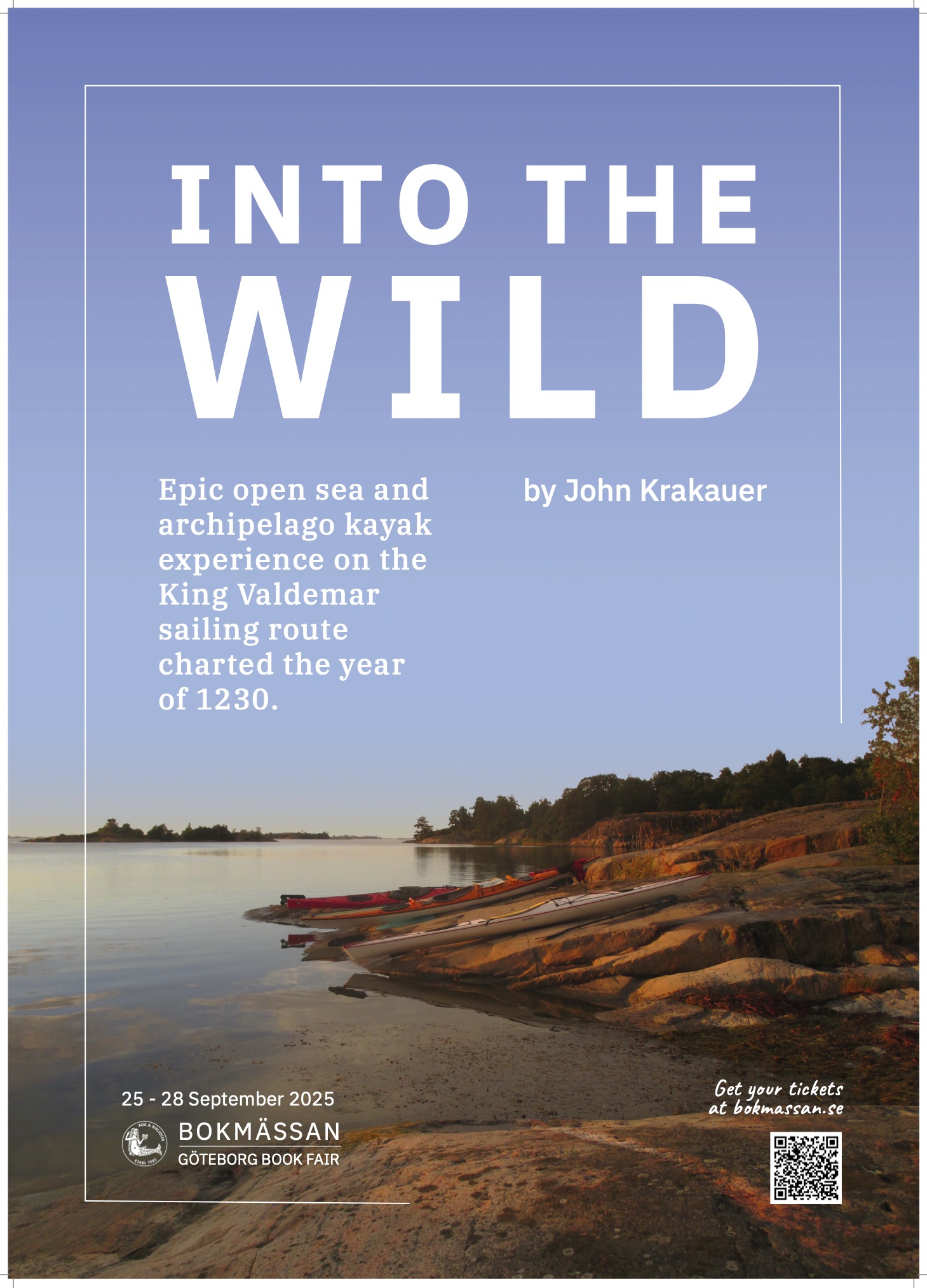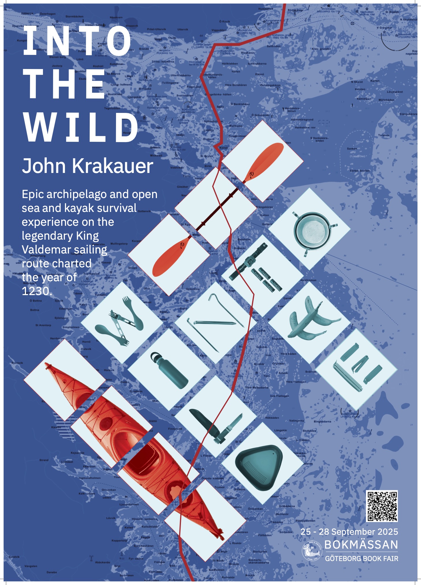 The design of the poster is a progression from my previous LNU class in design and typography. The task was to create an ad on the theme of limitations using only objects as characters, and to secondly, in a following step, explore contrast to create an alternate design, with a radically different outcome. The ad is promoting the launch of a fictitious second book by John Krakauer in an ‘Into The Wild’ series, to be presented by the author at the Gothenburg book fair in 2026. The objective was to deliver a better design by applying my new image editing skills in composing a more vivid ad.