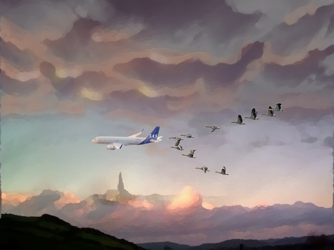 This image is a recomposition of an advanced layer exercise. The new composition takes an alternate approach to the cloud coloring as I noted that the original composition of high and low clouds did not make physical sense with incoming sun from the left. There should be sun reflections also in high clouds. Then, added a scene with flying geese in V-shape caught in the moment when an SAS Airbus was passing by for landing. The airplane, as the goose, is illuminated by the rising sun. Many layers used that could have been flattened, but kept for clarity on approach.