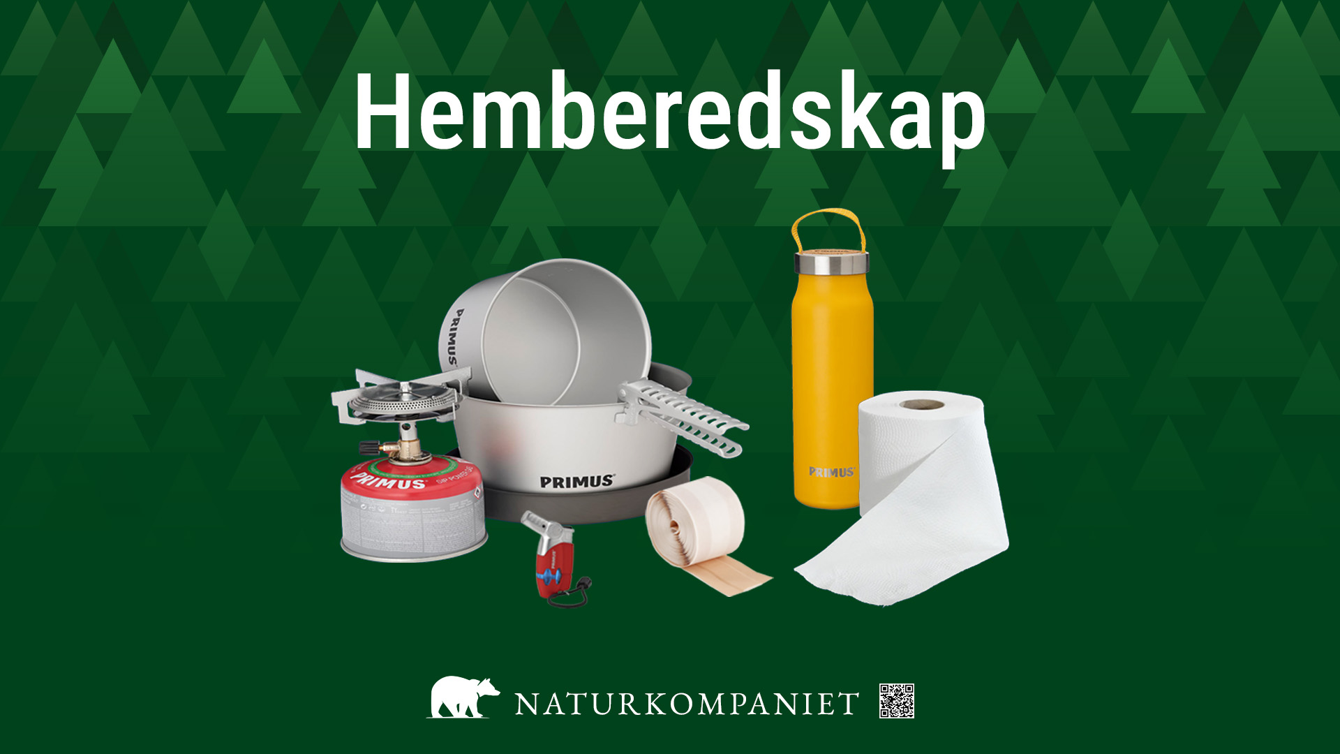 Design for a promotion image used os a billboard, poster, print, or screen from Naturkompaniet as part of a fictitious marketing campaign to push home products to consumers taking actions on guidance from Eng:’In case of crises or war’, Sv:’Om krisen eller kriget kommer’. The intent of the design is to attract viewer attention by using short, familiar phrases like “Home preparedness”, “Hemberedskap”, “Beredskapslager”. But also add a little twist to the message by introducing color and symbols of forest, nature, and expeditions. This leads the viewer to a dual conclusion and question: is this home preparation for a crisis, or for my vacation? The design is intentionally simple and clean. All to attract with a sticky, simple, actionable message: “Buy now to be prepared for any event”.